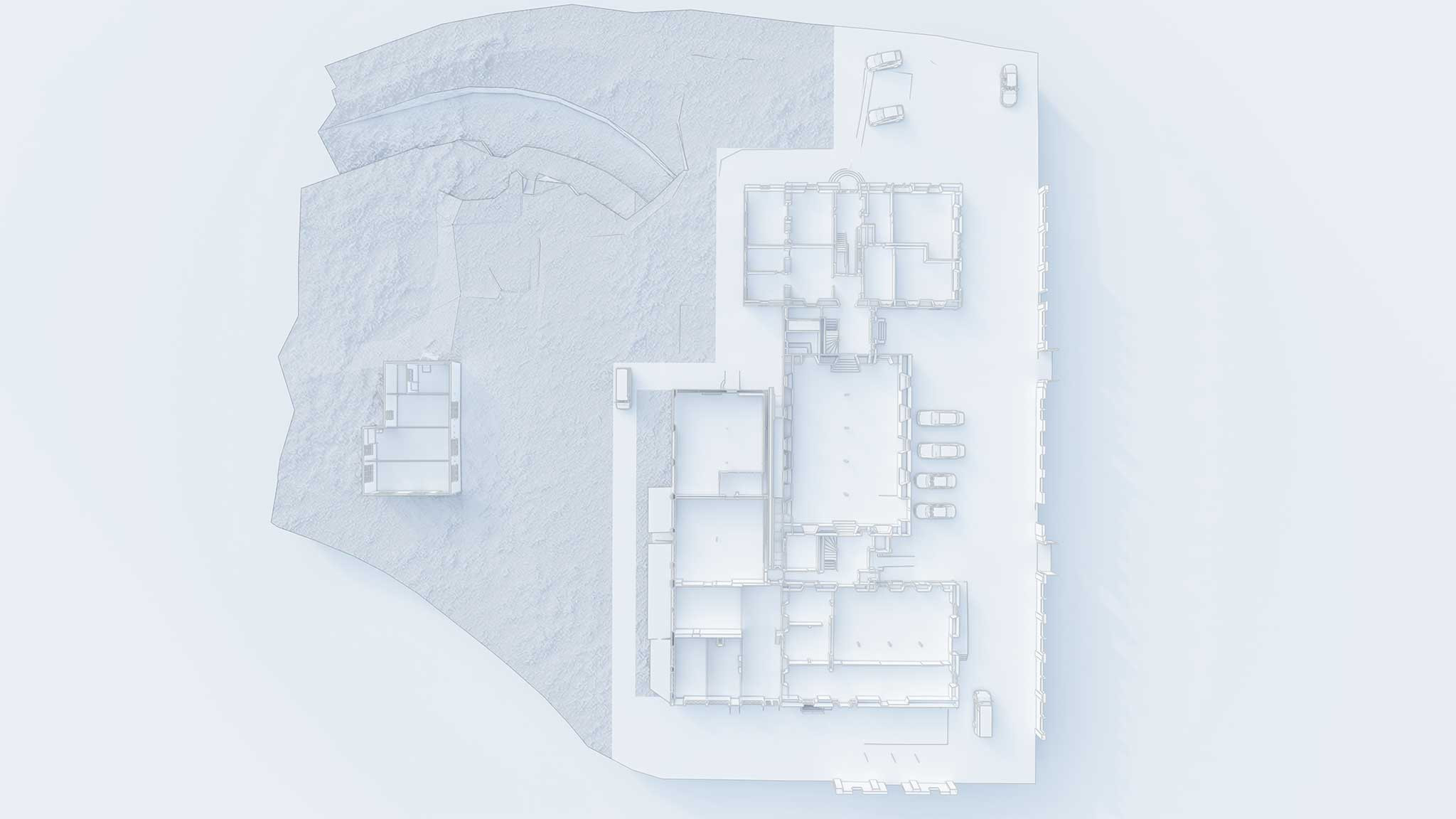 Aus der Gebäudeaufnahme wurde vom Walzmühlehaus ein detailgetreues 3D-Modell mit der CAD-Software ArchiCAD modelliert. Neben dem Hauptgebäude wurde auch die dazugehörige Schreinerei komplett in 3D vermessen. Zudem wurde von den unmittelbar umliegenden Gebäuden, jeweils strinseitig zum Hauptgebäude, die Fassaden modelliert, um das Areal im Gesamtkontext in 3D abbilden zu können.