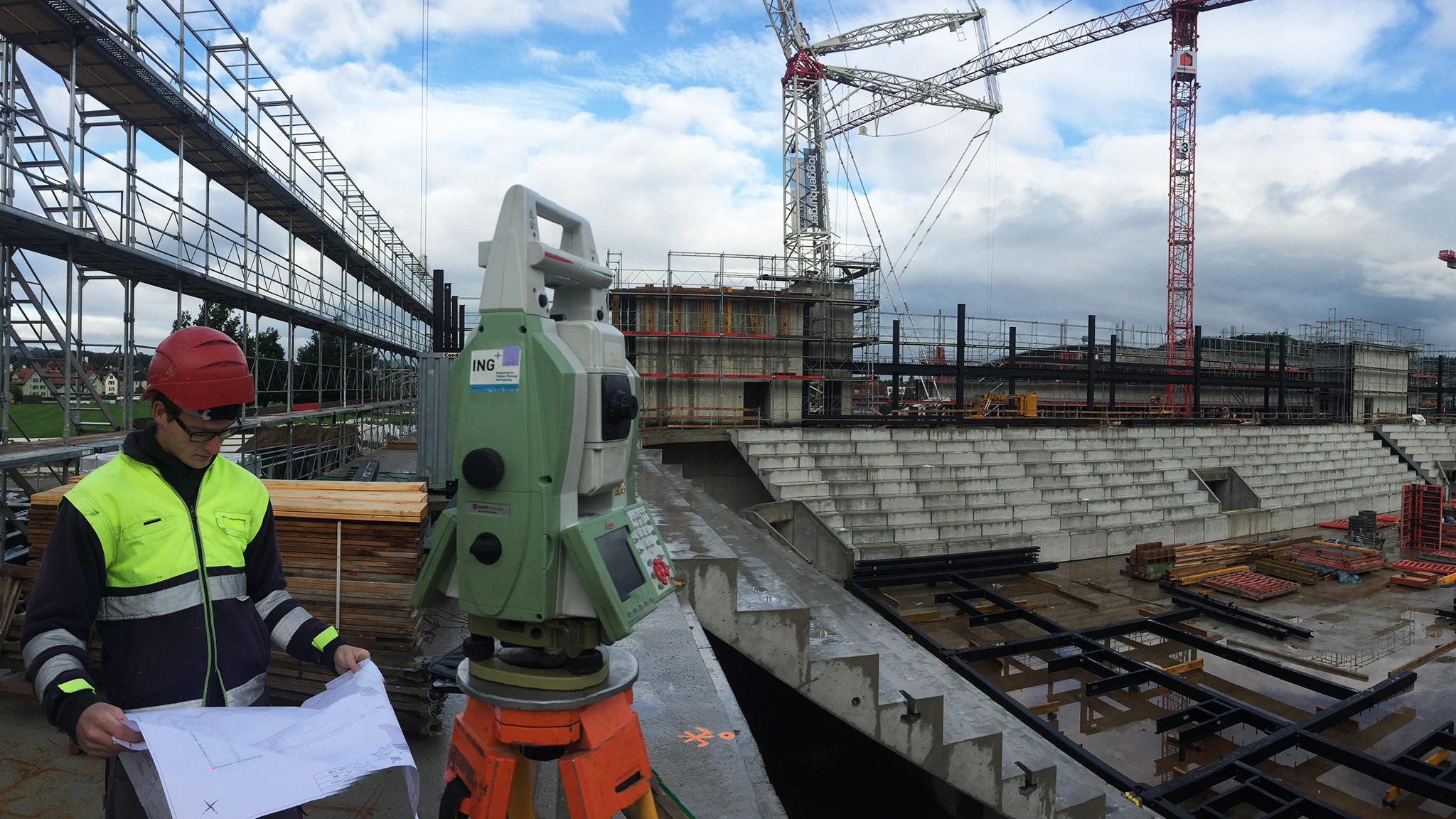 Neben dem Baustellenfixpunktnetz und präzisen Absteckungsarbeiten für die vorgefertigten Betonelemente wurden auch Setzungsmessungen durchgeführt. Während dem Rohbau wurde zudem das Terrain und die Aushubdepots mittels Laserscanning gescannt und ein 3D-Modell vom Terrain modelliert. Auch aus den Angaben der Rohplanie wurde ein 3D-Modell erstellt und visualisiert. Aus den Differenzvolumen hat ING PLUS ein exaktes Massenmanagement erarbeitet. Anhand dieser Aufnahmen und Berechnungen konnten unnötige Kosten für Materialtransporte von Aushub, Kies, etc. vermieden werden.
