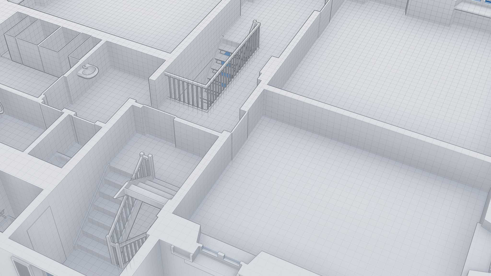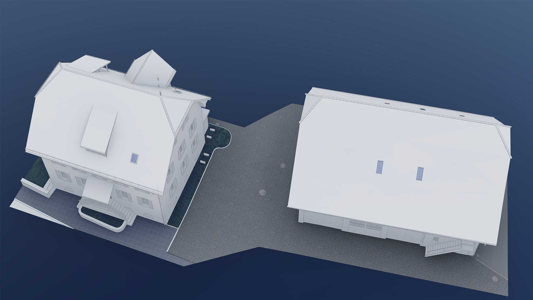 Die Scheune und das Mehrfamilienhaus wurden im Level of Detail 1:50 gezeichnet. Zusätzlich zur Detailmodellierung dieser zwei Objekte wurden auf dem Areal weitere Bestandsbauten, welche zum Abbruch vorgesehen waren, als Gebäudevolumen im Level of Detail 1:500 modelliert.