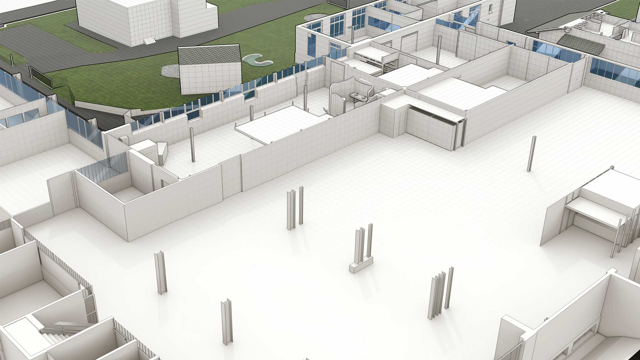 ING PLUS hat auf einem Gewerbeareal in Eschlikon im Kanton Thurgau eine Gebäudeaufnahme mittels 3D-Laserscanning vorgenommen und aus der Punktwolke ein 3D-Modell in ArchiCAD modelliert.