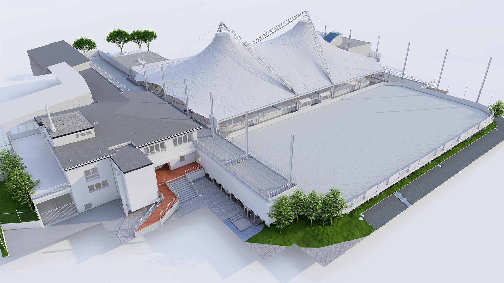 Die Gebäudeaufnahme vom Sportpark erfolgte auf einer Gesamtfläche von ca. 8'000 Quadratmetern. Die 3D-Modellierung beinhaltete das Betriebsgebäude bzw. die Betriebsanlage und die zwei Eisfelder. Ein Eisfeld ist dabei mit einer Art «Zeltdach» überdeckt, aber von Aussen trotzdem offen.
