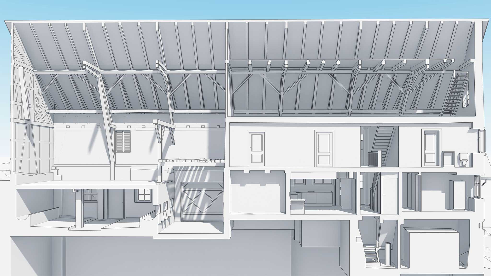 Im Rahmen des Projekts erfasste ING PLUS das Restaurant Engel sowie die angrenzende Scheune vollständig mittels modernem 3D-Laserscanning. Die berührungslose Messmethode ermöglichte eine schnelle und detailgetreue Aufnahme der bestehenden Gebäudestrukturen.