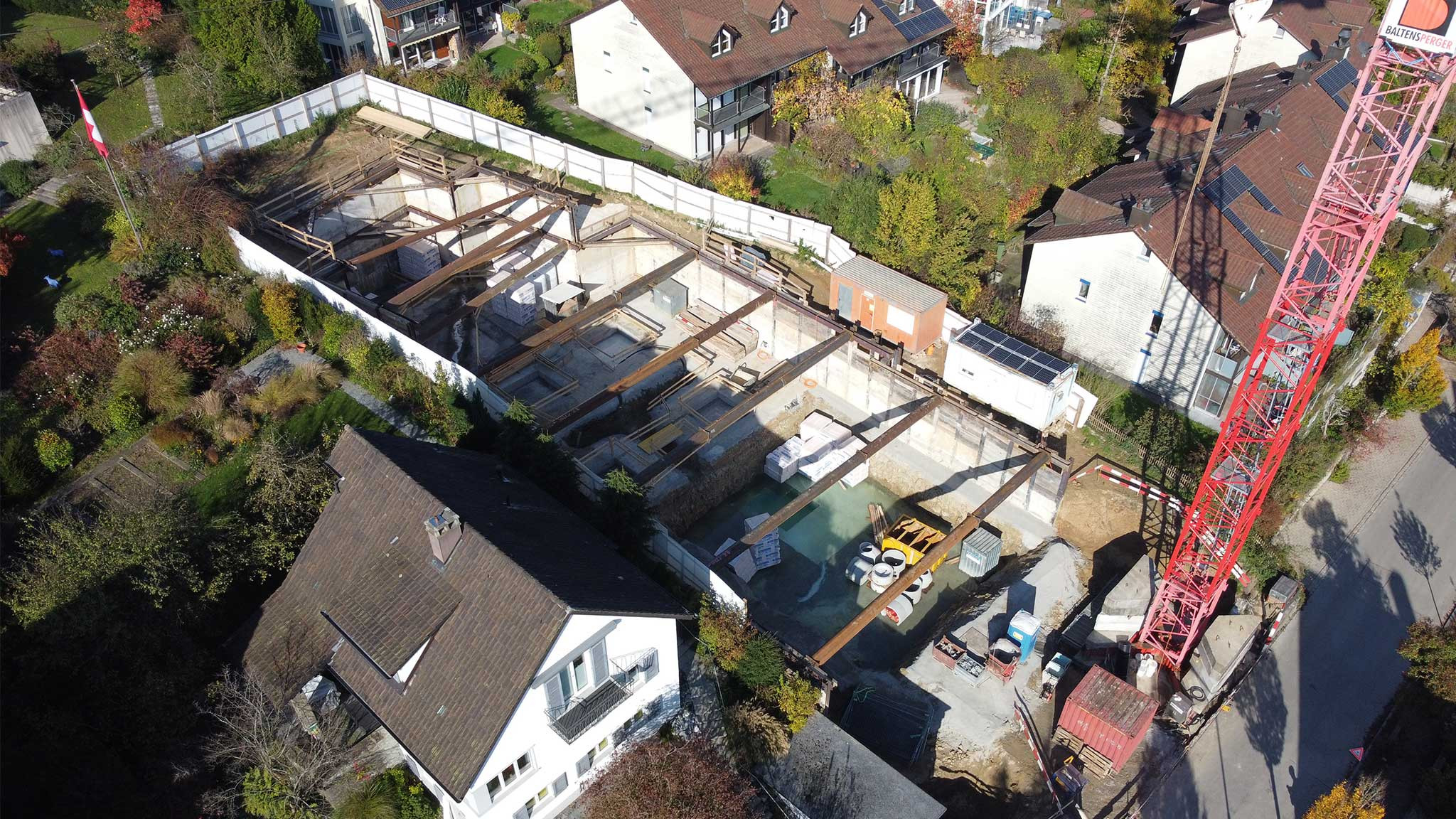Im Bereich Vermessung übernahm ING PLUS ein breites Spektrum an Leistungen. Dazu gehörten die Terrainaufnahme, Erstellung des Baugespanns, sowie der Unterhalt und die Pflege des Baustellenfixpunktnetzes. Für die sichere Bauausführung wurden Deformationsmessungen an der Baugrube und bestehenden Gebäuden durchgeführt, inklusive geodätischer Überwachung und Inklinometermessungen. Ergänzend stellte ING PLUS sämtliche Bauabsteckungen sowie die Umsetzung der Meterrisse präzise sicher und bereitete die Daten digital für die Bauherrschaft und das Planungsteam auf.