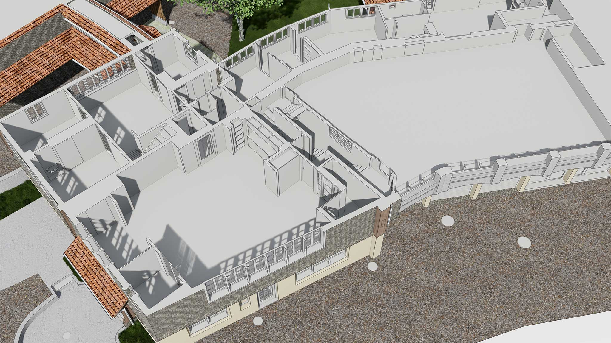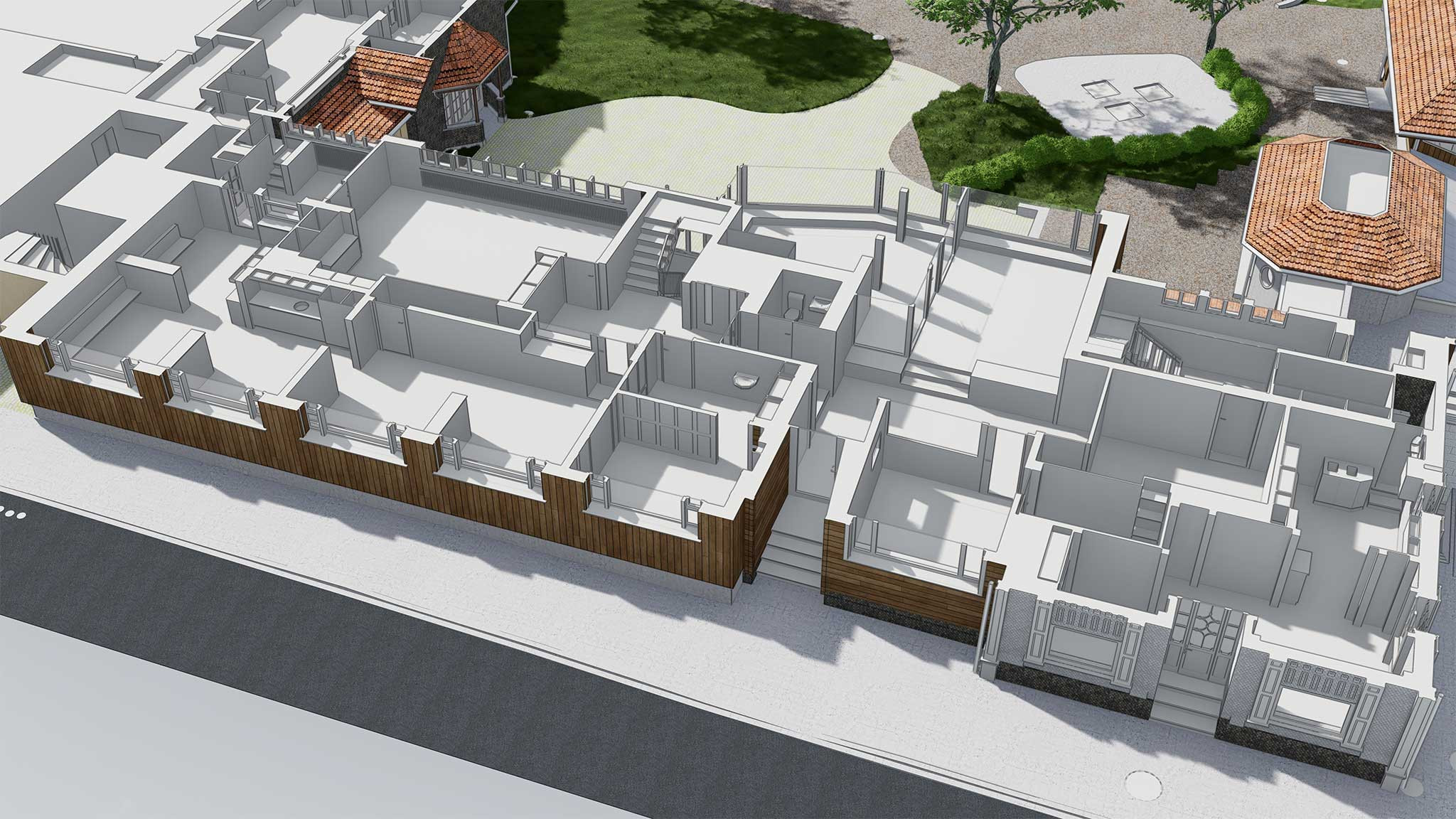 Ein Teil des Areals wurde zusätzlich in einem vereinfachten Modell im Massstab 1:500 ausschliesslich von aussen erfasst und modelliert, um einen Gesamtüberblick des Geländes zu ermöglichen. Das 3D-BIM-Modell unterstützt die Planung des Ersatzes eines der Schulgebäude und trägt zur Weiterentwicklung der Bossard Schule bei.